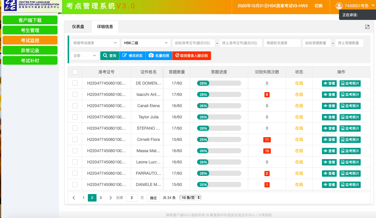 10月31日,米兰圣心孔院成功举办本年度第四次汉语水平考试居家网络考试。本次考试涵盖一至六所有等级,共有127名考生参加,创下本考点居家考试人数新高。