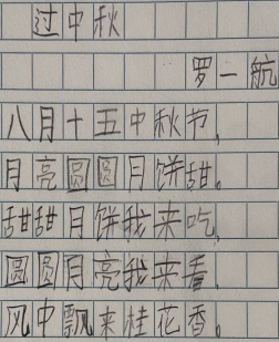 课后孔院举办的“中秋节”主题活动,也得到了学生的积极响应和家长的大力支持。在收到的众多作品中,佳作频出,令人赞叹。中文九的陈书欣和李恺源同学,富有感情地讲述了中秋节的动人传说,并且抒发了自己的真情实感。中文五的管宏铭、罗恩泉和陈享恩同学用文字记录了自己和家人是如何庆中秋的,十分有趣。而中文四的吴宣龙、张育晨、余子婧、李紫欣等同学利用课本所学,采用写信的方式给自己的亲朋好友寄去秋日的思念,感情饱满,内容充实。