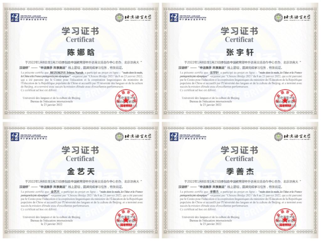 结营仪式最后,公布了本次“中法携手,贡献奥运”线上团组的优秀同学名单。同时,本次团组全体同学的优秀表现也得到了老师们的一致肯定,最终都收获了本次活动的结营证书作为纪念。