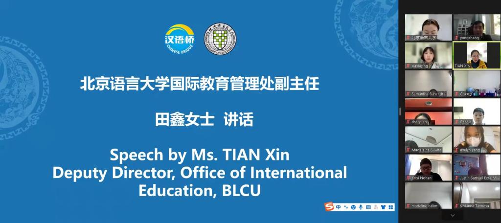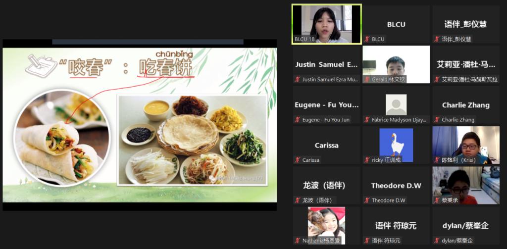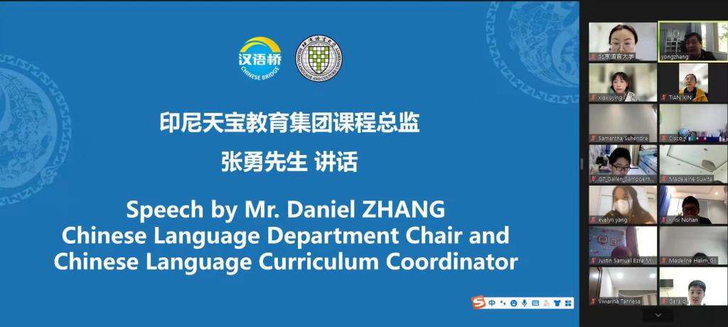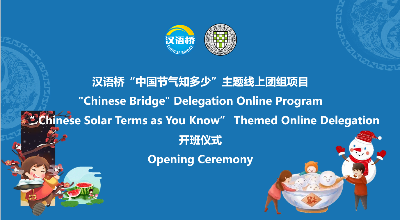 近日,由教育部中外语言交流合作中心主办、北京语言大学承办的2021汉语桥“中国节气知多少”主题在线团组顺利开营。北京语言大学国际教育管理处副处长田鑫女士、印度尼西亚天宝教育集团课程总监张勇先生,以及参加此次项目的北语师生和印尼师生齐聚云端,参加了此次在线团组的开班仪式。