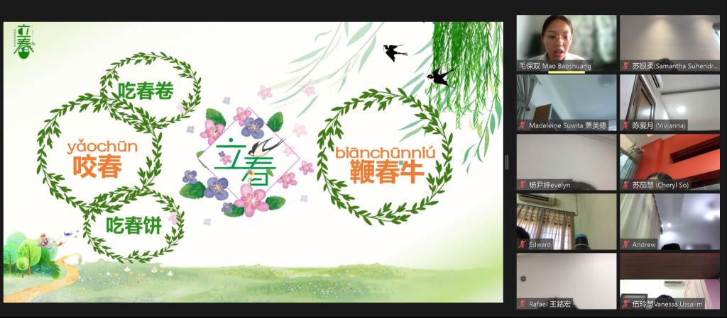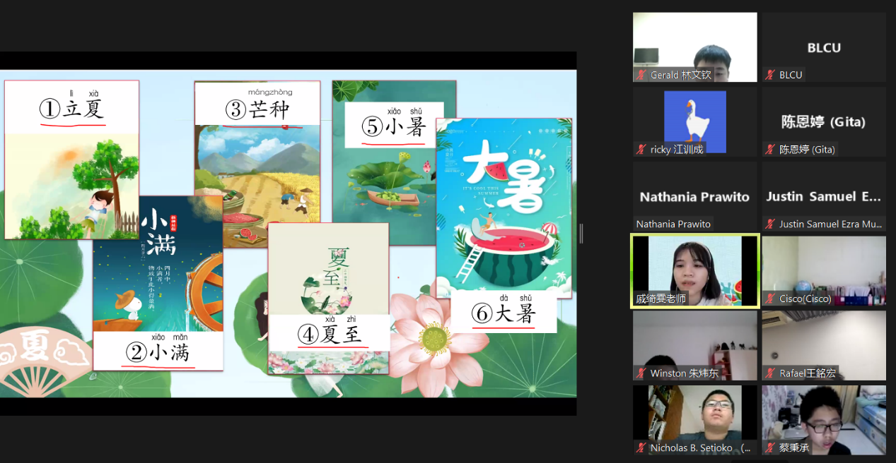 此次线上团组项目顺利启动离不开印尼天宝教育集团大力支持。印尼天宝教育集团是北语的重要合作伙伴,双方一直在汉语国际教育领域密切合作。本次项目面向天宝教育集团中学生,以中国传统二十四节气为主题展开。课程内容由浅入深,以学生熟知的季节引入,进而介绍节气的由来,选取典型的节气深入讲解。