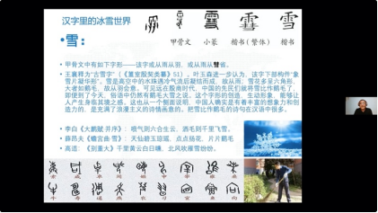在“汉字里的冰雪世界”版块中,孟老师首先为大家讲解了“冰雪”二字的由来。孟老师先从《说文解字》中对“冰”的解释谈起:冰,水坚也,从仌从水。“冰”与“冶”字右边的“冫”都是指液体固化后形成的固体形态。“冬”字下面也是“冰”,而“冬“字上面的字符,实际上是一个绳子的两头被打上扣子后那个样子的象形。中国古代先民有“结绳记事”的历史,这个字符很可能跟那段历史有关系。
