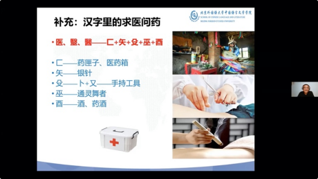 在“汉字里的中医学问”版块中,孟老师为大家补充讲解了汉字里的“求医问药”,从汉字本身的视角向大家介绍了中国的传统医药。孟老师讲到:汉字“医”,外框“匚”是古代盛放东西的方形器物,借指医生用的木箱子,即医药箱;而“矢”则源自弓箭的箭头“→”,后用“矢”表示特别尖锐的针,即银针。而“灸”字则指点燃手里的艾草,用艾草燃烧发出的微弱的火和产生的烟雾去熏染身体受到损害的部位。由此可见,“针灸”在古代中国就已经被作为医疗的重要手段。