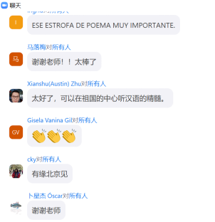 委内瑞拉学生团组的直播课程之一,同时面向整个拉美及西班牙地区的西语区学员同步开放。来自汉语桥团组“中医瑰宝——针灸与按摩”阿根廷学员以及“玛雅文明与中国文明对话”墨西哥学员一同在线参与了学习。此外还有很多海外本土教师、国内中文教师同时在线参与。