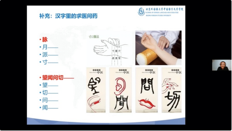 孟老师还从汉字字形构成的角度为大家讲解了中医“望、闻、问、切”这四个诊疗方式,配合图片示例,用通俗易懂的语言生动形象地解释了中医诊疗的过程,为大家详细解读了隐藏在汉字里的“中医”学问。孟老师风趣幽默、深入浅出的讲解,赢得老师和学生们的好评,并引发热议。
