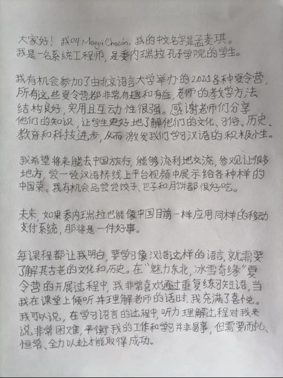 近日,由教育部中外语言交流合作中心主办、北京语言大学承办的2021年“汉语桥”团组“魅力东北,冰雪奇缘”主题线上交流营举办。来自委瑞内拉等西语区国家的一百余位学员参与其中,通过丰富多彩的课程,学习中文知识、体验中华文化,彼此结下了深厚的友谊。