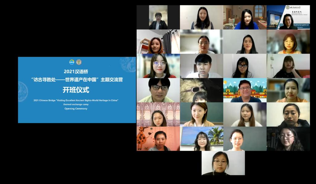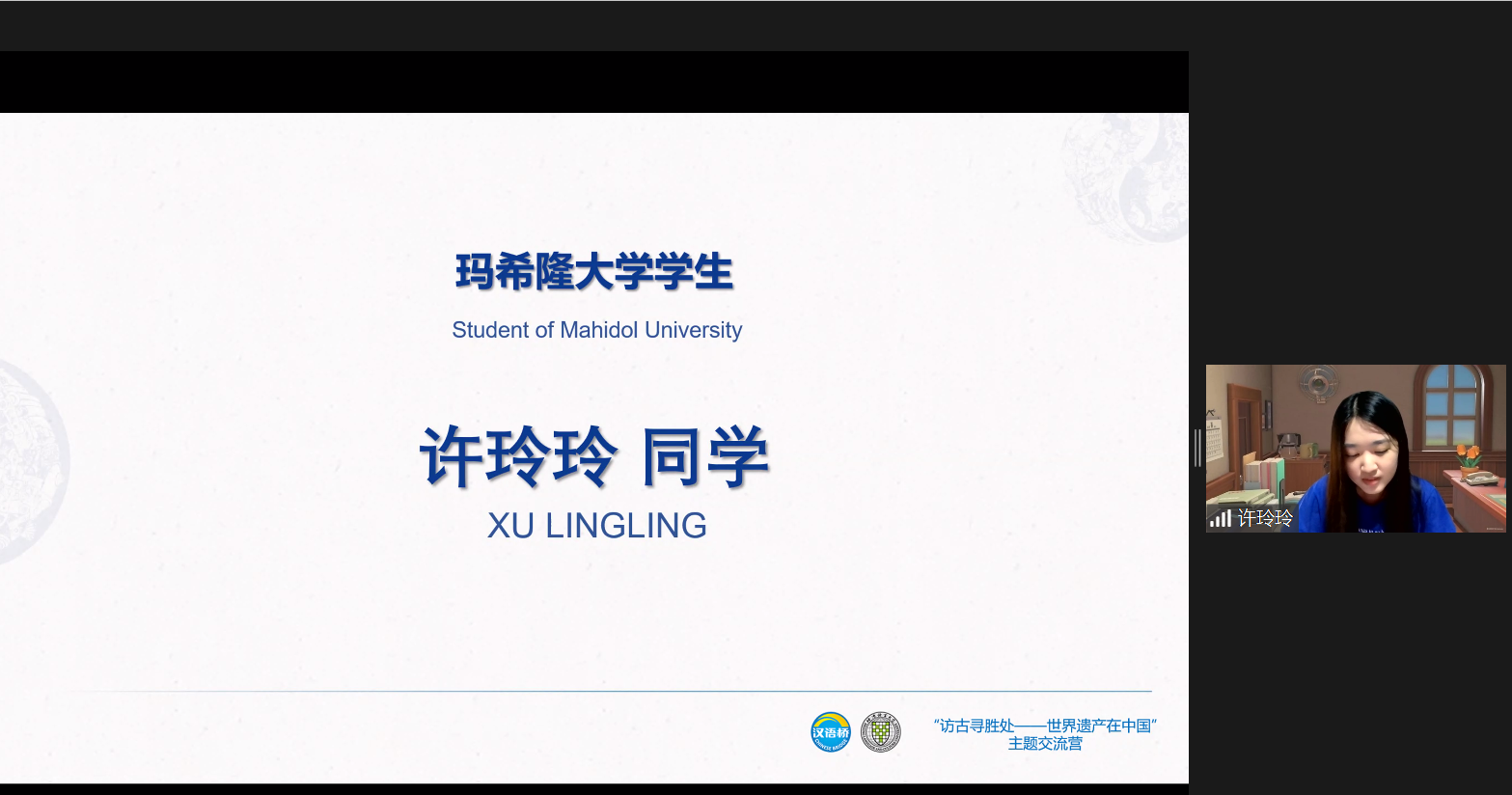 近日,由教育部中外语言交流合作中心主办、北京语言大学承办的2021汉语桥“访古寻胜处——世界遗产在中国”主题交流营顺利开营。玛希隆大学人文学院系主任王碧仁、玛希隆大学人文学院系副主任张曹武先生、北京语言大学国际教育管理处副处长戴媛媛女士、北京语言大学泰国代表处主任于美英女士、北京语言大国际中文教师、语伴及玛希隆大学130余名学生齐聚云端,参加了此次主题交流营。