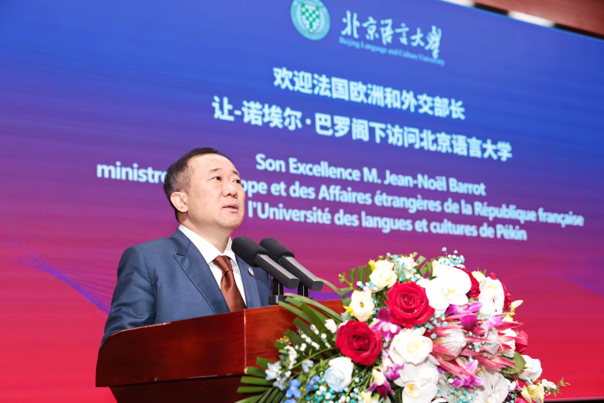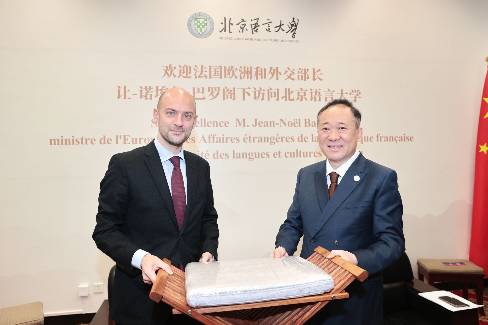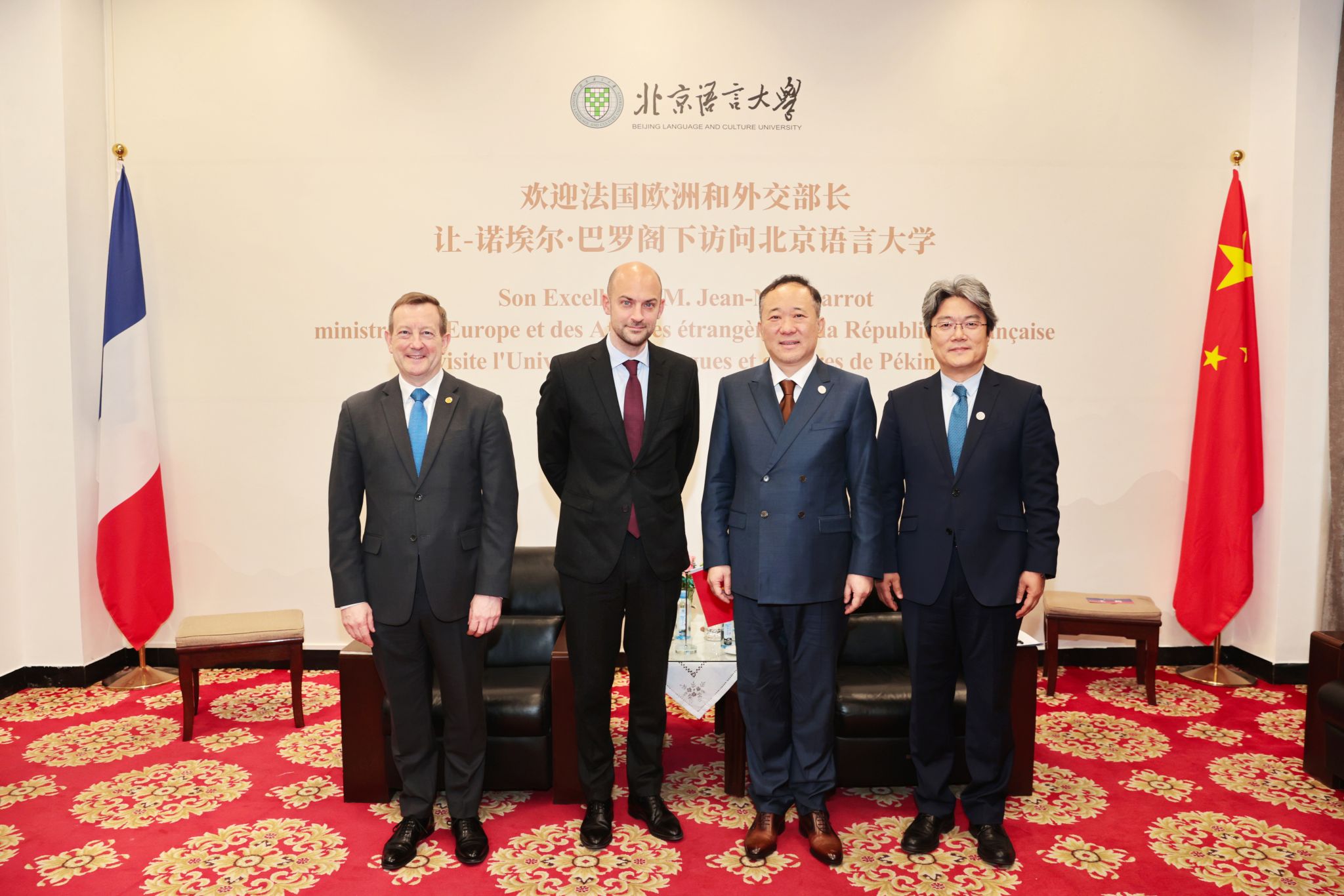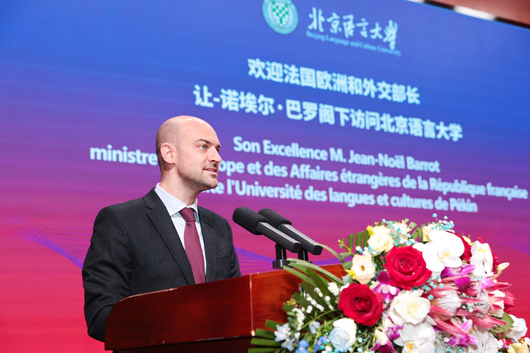 北语新闻网3月28日电(通讯员 王娜娜 摄影 魏达)北京,2025年3月27日——在中法建交61周年之际,法兰西共和国欧洲和外交部长让-诺埃尔·巴罗阁下与法国驻华大使白玉堂,法国亚洲与大洋洲司司长伯努瓦·吉代,部长办公室顾问阿黛尔·让鲁瓦-布罗兹,巴黎选区国民议会议员、法中友好小组主席西尔万·马亚尔和欧洲议会议员玛丽-皮埃尔·韦德雷纳等20余位法国高级官员访问北京语言大学,巴罗外长实地考察中法人文交流空间项目施工情况并面向北京语言大学师生发表演讲。此次访问正值第七次中法高级别人文交流机制筹备关键阶段,为深化两国人文领域合作注入新动能。北京语言大学校长段鹏、副校长张宝钧及200余位中外师生代表出席了活动。