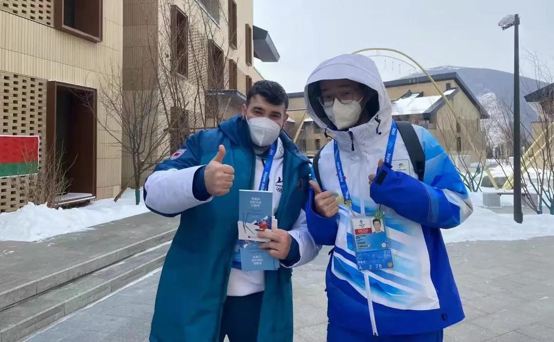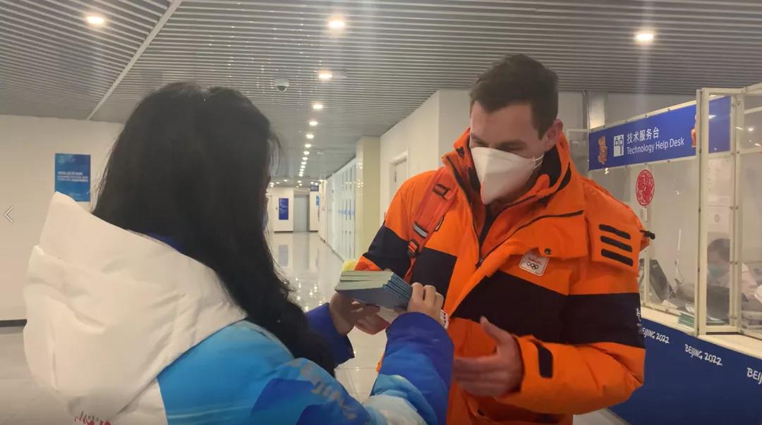 蒙古代表团的官员巴雅图雅是北京语言大学校友,曾于2005-2007年间在北京语言大学学习中文。带队教师玄铮和NOC助理孙维茁一起把口袋书赠送给她,她开心道谢,笑着表示会继续努力学习中文,“当年我只学过两年,现在中文还不是太好,平日里跟助理们基本都是说英文。”她夸奖北语志愿者们工作做得非常好,给了她很多帮助和温暖。玄铮老师表示今年是北语校庆60周年,欢迎她随时回到中国、回到北语。玄铮、毛星月两位老师还将《冬奥会交际汉语口袋书》分享赠送给了国际奥委会官员,对方十分开心并表达了谢意,还表示会与身边人一起分享。
