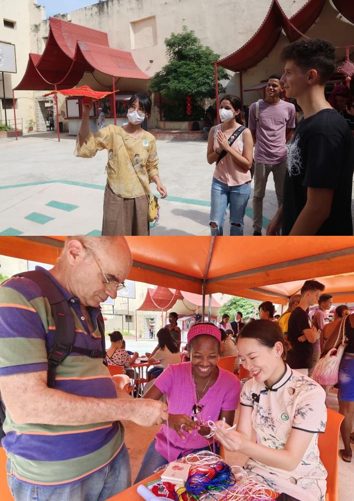 中国结寓意吉祥如意,编法简易、结形美观,引来很多古巴朋友驻足学习。书法素来是中国的文化名片,宣纸上的中秋题词十分应景——孔院学生王以然在了解到“秋”这个会意字的部件构成和意义时十分高兴,表示自己又学会了新的汉字。剪纸和绘画也备受欢迎,大家在剪刀、绘笔“觥筹交错”间谈笑风生,其乐无穷。古琴也吸引了许多好奇的朋友,尝试弹拨这一音色独特的东方乐器。中国东北地区的二人转手绢,也引来游览者纷纷体验,跃跃欲试。