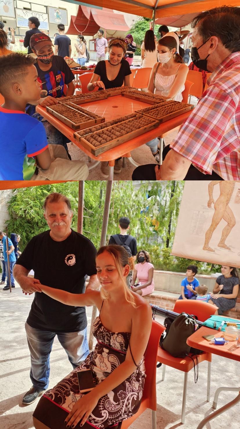 珠算展位则带领大家学习极具实用价值的传统文化知识,众人团团围坐,以算盘为工具进行数字计算,了解中国古代数学的发达;还有很多古巴朋友来到孔院中医老师卡洛斯(Carlos)的展位,体验针灸、按摩和刮痧。