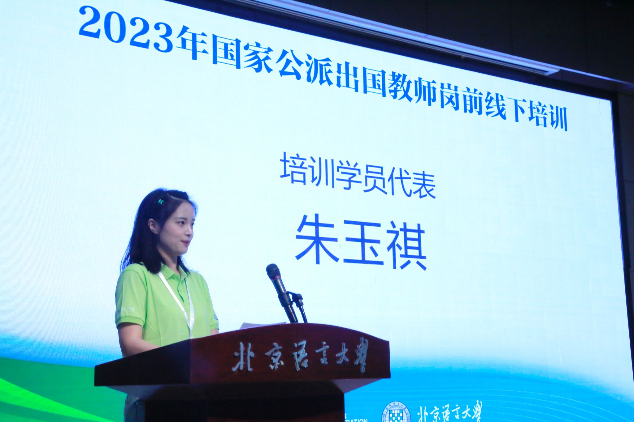 培训学员代表朱玉琪老师对语合中心和北京语言大学表示感谢。她号召即将在海外从事国际中文教育的老师们为中外友谊架起一座坚实的桥梁,做有责任感、使命感、荣誉感的民间文化使者。