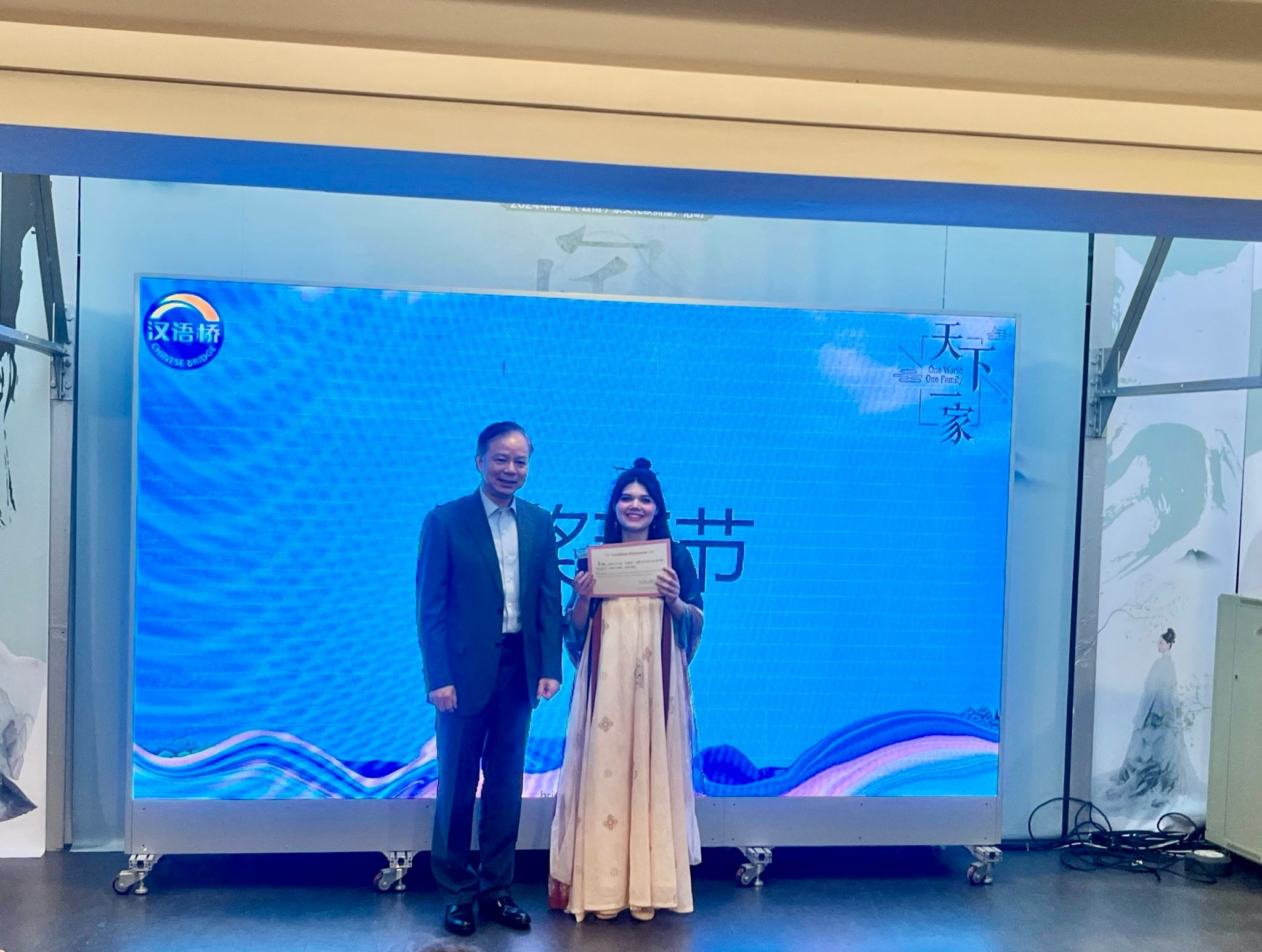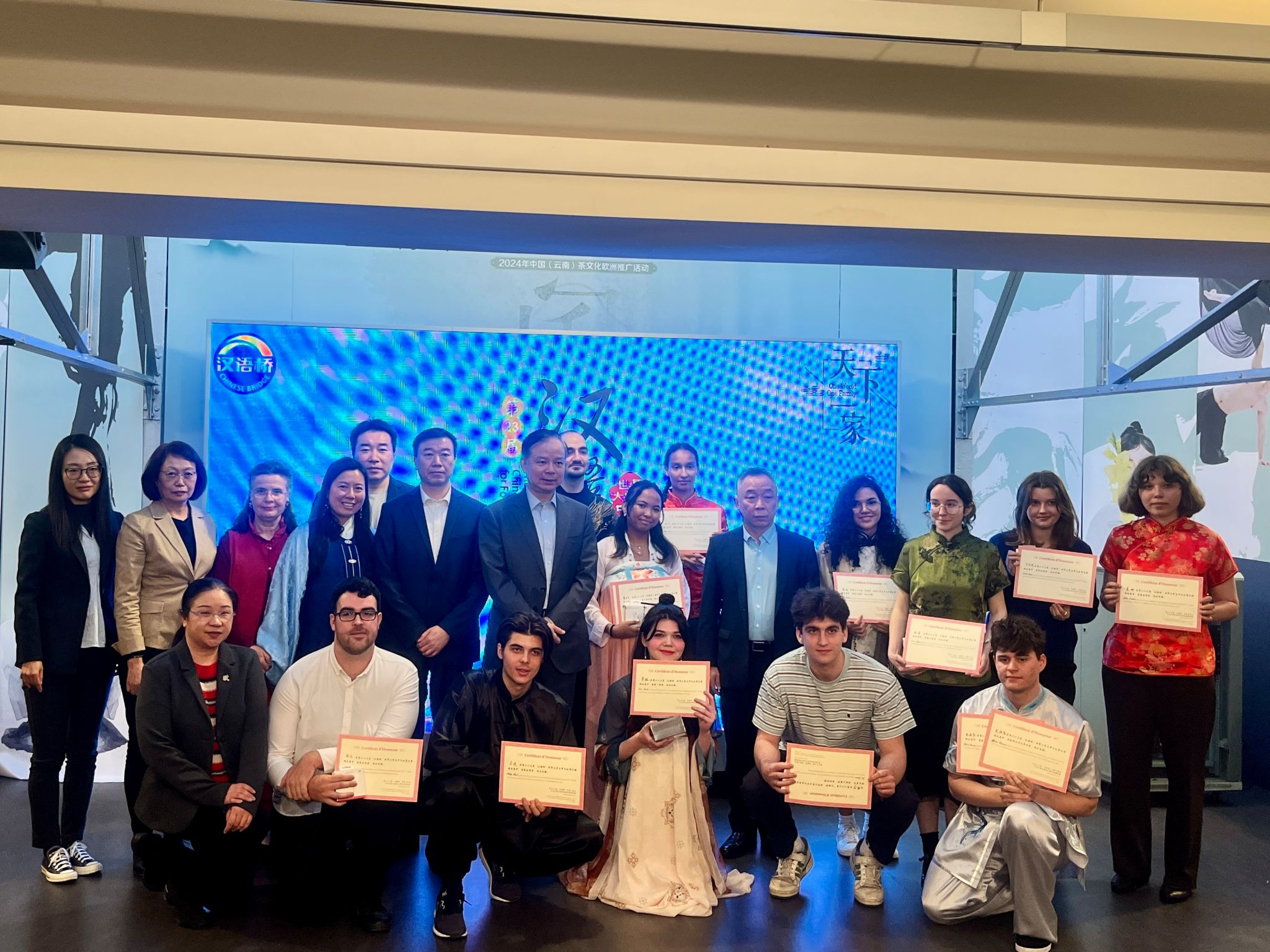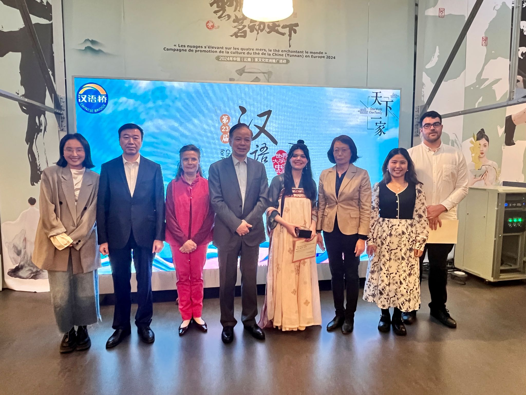 经过激烈的角逐,李路(Lilou BOURHIS)凭借其流利的中文表达、丰富的文化知识积累以及精彩的才艺展示,赢得了评委们的一致认可和赞赏,最终脱颖而出,摘得桂冠,并将代表法国大学生参加在中国举行的世界“汉语桥”总决赛。陈力公使为李路(Lilou BOURHIS)颁奖,并祝贺拉罗谢尔孔子学院和拉罗谢尔大学在此次比赛中取得了优异成绩。