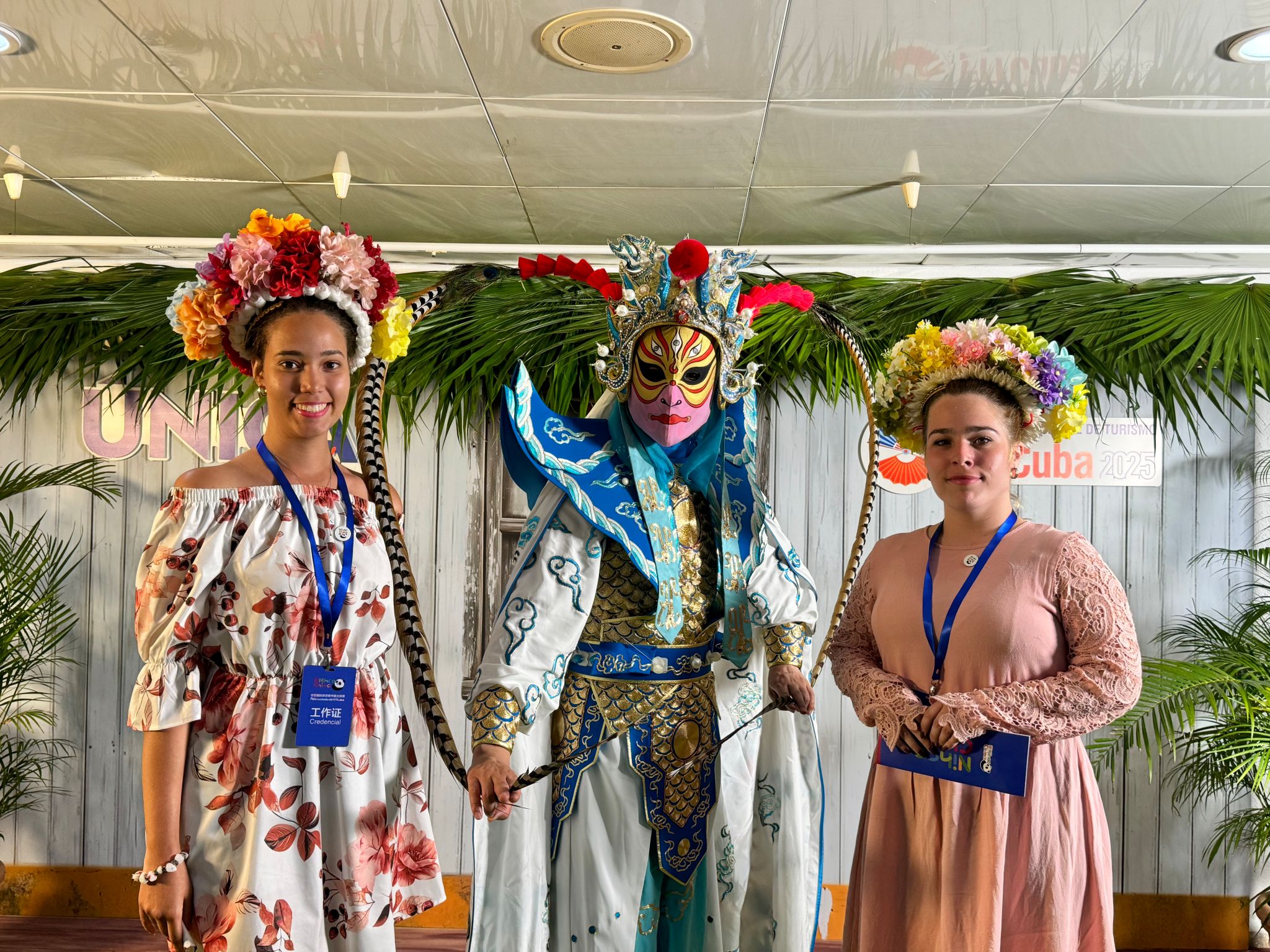作为古巴唯一的汉语教学与文化传播机构,哈瓦那大学孔子学院在此次中国主宾国展区的成功亮相中承担了多项重要任务,为活动的顺利开展提供了全方位的支持。从展区布置到文化活动策划,从翻译工作到艺术合作协调,孔子学院师生以高度的专业精神和文化使命感,充分展示了中华文化的独特魅力。在200平方米的“你好!中国”主宾国展区内,孔子学院协助策划并组织了中国世界遗产图片展、非物质文化遗产体验以及旅游推介会等系列活动,吸引了来自全球的850余名国际旅游业代表及2000余名古巴从业者。在非物质文化遗产展示环节,孔子学院团队协助开展了糖画、川剧变脸、簪花、非遗风筝、漆扇制作等具有浓厚中国传统特色的互动体验项目,为古巴民众和国际嘉宾营造了沉浸式的文化氛围,彰显中国传统文化的深厚底蕴。