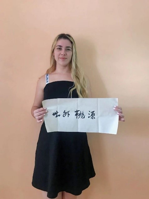 “我的老公是中国人,我想学习汉语,可以和他的家人交流,所以我就来到孔子学院开始学习汉语。四年前,一个在古巴的中国朋友会书法,他看我对中国书法很感兴趣,就送给我一套文房四宝,从那以后我就开始练习书法。我很喜欢中国书法,中国书法是一门艺术。”——李乐笛