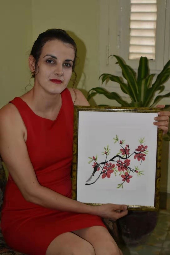 “我从小在农村长大,来到哈瓦那读大学时,常常在唐人街看到中国人,我想知道他们在说什么,他们的文字怎么写,所以决定在孔子学院学习中文。我对中国文化很感兴趣,以前还参加过中文歌曲、中国书法的比赛,这是我第一次参加绘画比赛。我每天在家里练习八个多小时,我最喜欢画花儿,还喜欢中国著名画家齐白石的画。现在我是一名设计师,我有一个梦想,想把中式和西式风格融合在一起,创立一个自己的服装品牌。”——李夏
