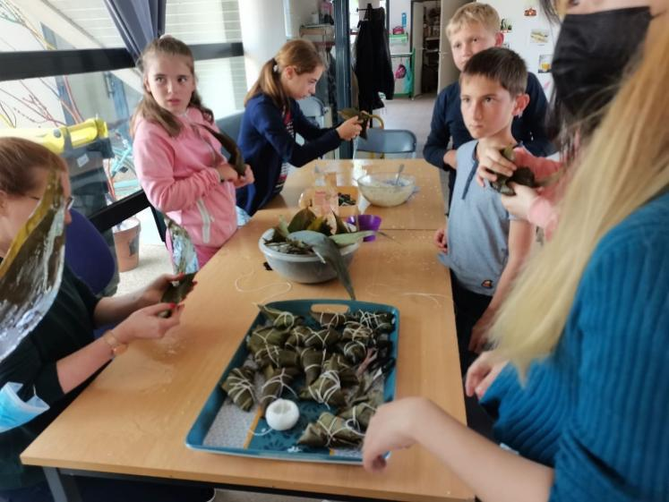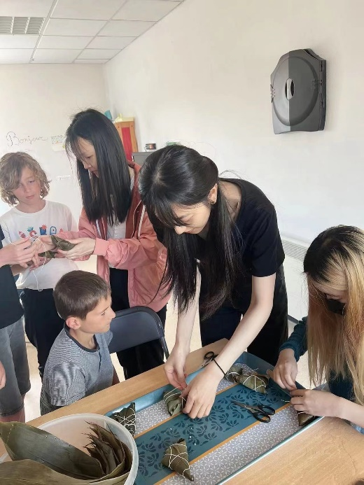 为了让法国儿童感受和体验中国传统习俗,户外活动结束后,孔院志愿者向学生们讲起了端午节的由来和节日习俗,并精心准备了包制粽子的食材,手把手地指导大家包起了粽子。对这些第一次尝试包粽子的法国孩子来说,端午节粽子和五彩丝线的美好寓意令他们感到惊奇,激起了他们对中国传统习俗的求知欲。孩子们还表示要在自己包的粽子上作记号,争取吃到自己亲手包的粽子,现场气氛十分热闹。
