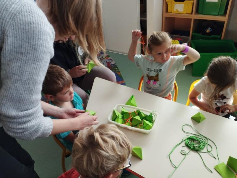 热闹的场面也吸引了在学校托管的幼儿,为了满足这些四五岁孩子的愿望,孔院实习生们准备了彩绳和纸粽,教孩子们将五彩丝线缠绕在纸粽上,作为端午节礼物带回家送给父母,寄托对家人的美好愿望。