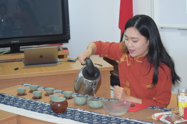在大家对中国茶文化有了基本的了解之后,徐玉锦老师带领学员们正式开始了茶文化体验之旅。学员们前后品尝了普洱茶、茉莉花茶以及菊花枸杞茶。在泡茶、品茶过程中,徐老师与学员们一起在实践中探究与讨论了不同茶的泡制方法、香气、味道、口感等,让学员对中国茶文化有了切身的体验和更为直观的感受。讨论过程中,话题层层推进,双方对茶在中国传统习俗与现代生活中的地位以及罗马尼亚文化中的“茶”等内容展开了深入的交流,增进了双方对彼此文化的了解和认知。