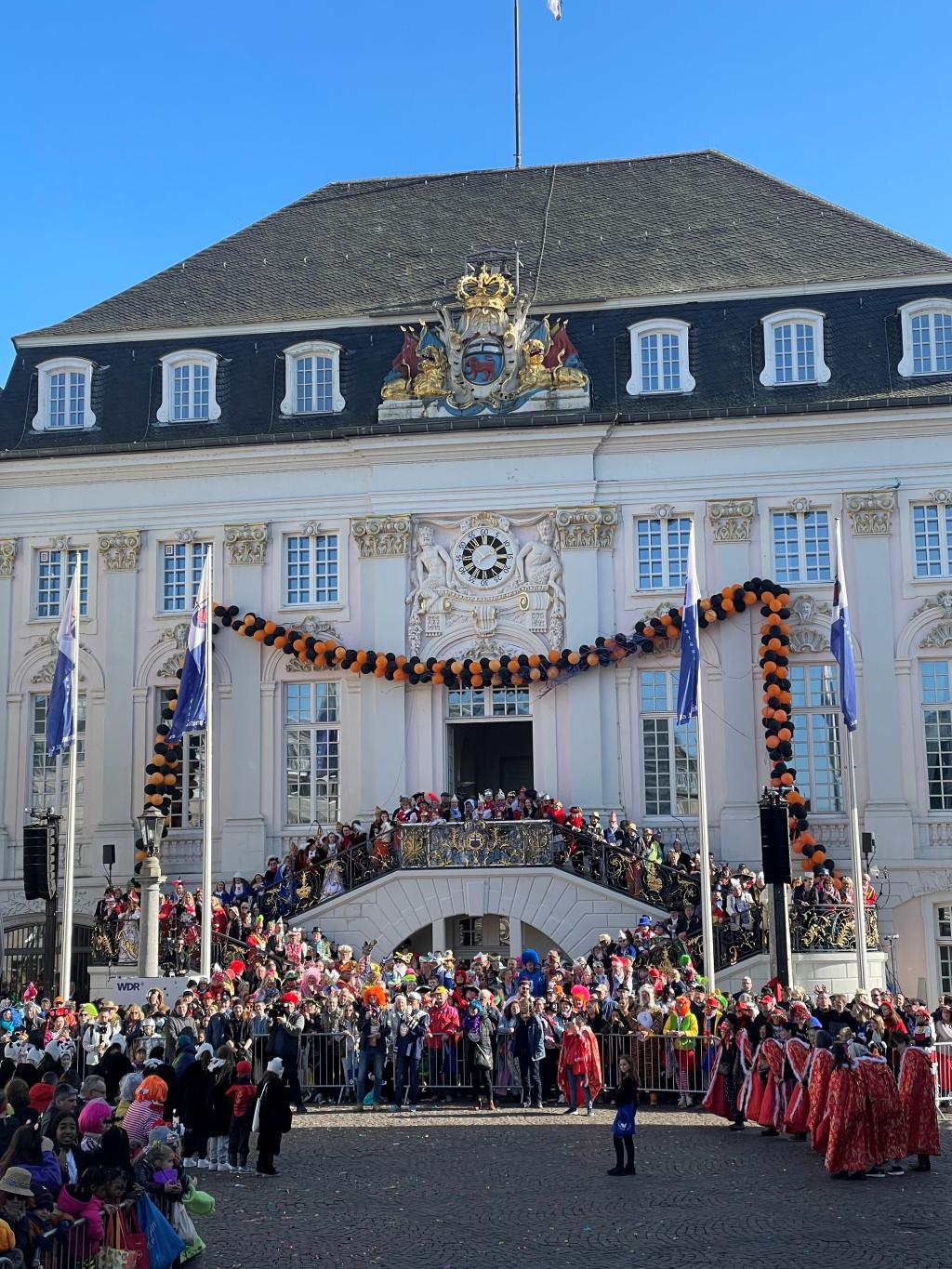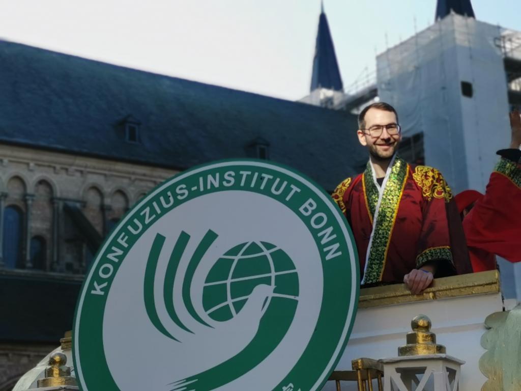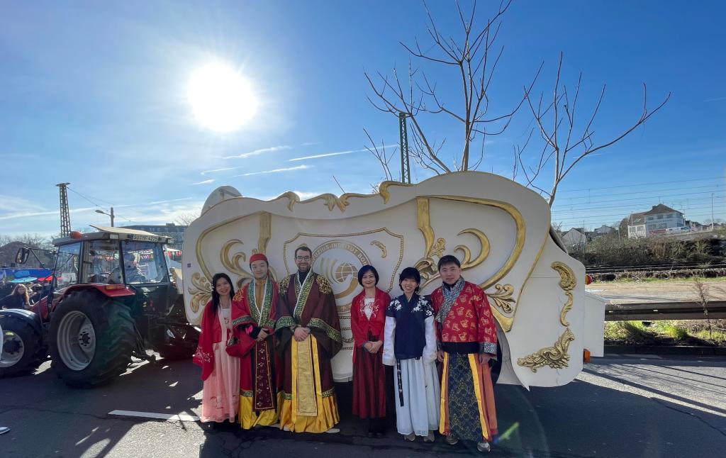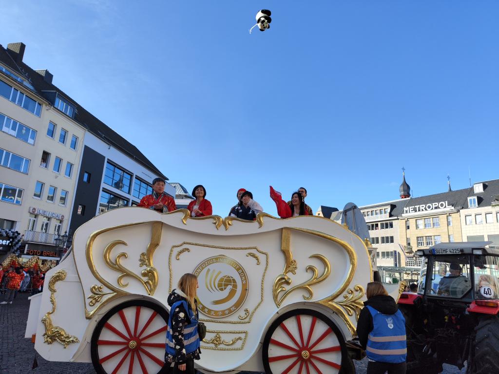 当地时间2月20日,波恩作为莱茵地区狂欢节的中心,组织了盛大的花车游行活动,吸引了成千上万来自世界各地的游客。花车游行于12点正式开始,由3800余人组成的游行队伍缓缓向市中心走去,此次活动路线全程约3.8千米,前后共历经4小时左右,还被WDR(西德广播公司)等多家媒体争相报道,值得一提的是,波恩市政府在波恩城区设立了十余个广播站点,为民众介绍来往的花车队伍。在各式各样令人眼花缭乱的队伍中,还属由波恩孔子学院和中德文化交流波恩嘉年华协会组成的“中国方阵”最为亮眼,波恩孔子学院工作人员身穿中国传统服饰,或对大家招手、微笑,或向路边民众抛洒饱含美好祝愿的糖果、幸运饼干、中国书签和憨态可鞠的熊猫玩偶,又或和市民朋友一起振臂高呼“Bonn Alaaf”!(波恩,万岁!)大家欢呼雀跃,情绪激昂,火热的气氛感染了现场的每一个人,所有人都深深沉浸在节日的欢乐中。当波恩孔院的花车经过广播站点时,主持人便热情地向在场民众介绍波恩孔院,并由衷感谢波恩孔院对中德友谊稳固发展做出的贡献。