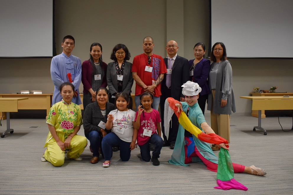 大会组委会在议程上专门为孔院安排了45分钟的中国文化展示单元。借此机会,孔院向与会专家奉献了一场精彩的中国文化展演。展演分中国民族舞蹈、中国武术两部分。首先由南卡资深华人舞蹈家殷岚老师带来一段具有浓郁京剧韵味的民族舞蹈。优美灵动的舞姿,再配以京剧《梨花颂》的音乐伴奏,令观众如痴如醉。接下来,来自重庆的太极师傅唐毅、来自内蒙古的功夫女侠张一帆分别为观众带来了极具观赏性的太极扇和九节鞭表演。唐毅炉火纯青的陈氏太极表演,动作柔和却充满力量,虽然只是短短五分钟,背后的太极服已经被汗水浸透。张一帆表演的九节鞭将中国武术的力与美演绎得淋漓尽致,将全场表演推向了高潮,赢得了全场观众的阵阵掌声和欢呼声。
