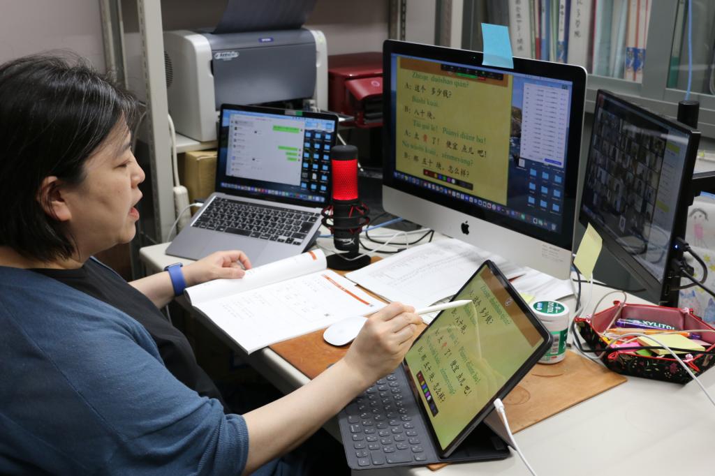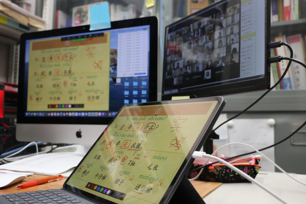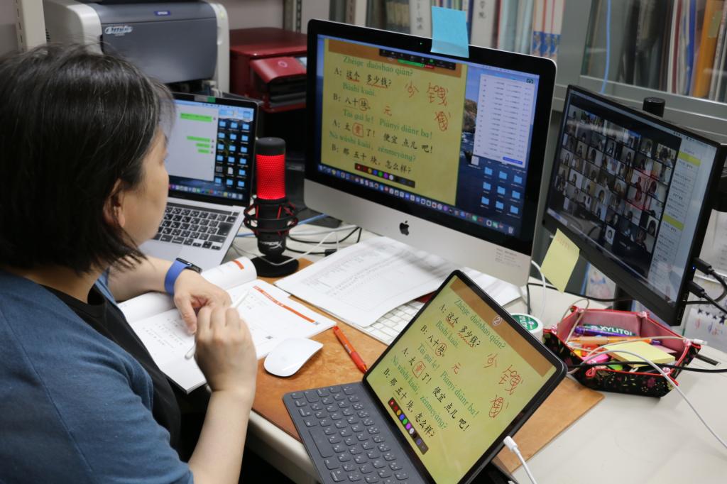 “网课”,面对着电脑不熟、不会用zoom、Blackboard和Quizlet等诸多难题,学生们努力克服通过多练习渐渐地适应了网课模式。讲座正式开始后,高中生们每天都被分成不同的组(3-4人)和外大生以及中国留学生一起,以“汉语发音”“汉语会话”“汉语演讲”和“汉语迷你短剧表演”为主题进行小组学习,丰富多彩的内容和别出心裁的形式使高中生们感受到了学习汉语的快乐。