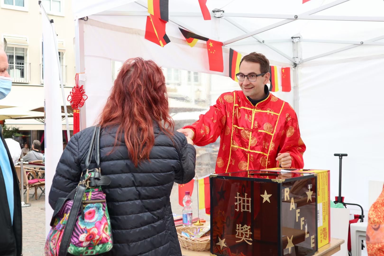 10月2日一大早,波恩孔子学院全体员工便已携带所有的活动道具,装饰用品和精美礼物前往活动现场并立即紧锣密鼓地筹备起来。此次活动共有三个环节,其一是“幸运大转盘”,往来市民皆可参与,参与者须先转动印有中文数字的转盘,随即回答与之相对应的汉语常识题目,比如全球以汉语为母语的人大约有多少?汉语共有多少个偏旁部首?或者看一个汉字猜其意思等等,答对者便有机会参与抽奖赢得大礼,比如波恩孔子学院专属定制的钥匙链,憨态可掬的熊猫玩偶,有趣美味的幸运饼干和精致小巧的中德双语书签等等,若哪位幸运儿抽中数字8和88,即可获得一整套免费的中文课程。为使参与活动的市民更加近距离地感受汉语、感受中华文化的魅力,书法家唐红老师为现场的每一位来访者书写了他们各自的汉语名字,唐红老师笔下的名字既有德语的魅力,又含中文之蕴意,每一个都完美呈现出了中德文化的交织相融。除此之外,活动当天的下午1点、2点、3点波恩孔子学院还为对汉语感兴趣的访客提供汉语体验课,半个小时的课程为现场学员打开了了解、学习这门古老语言的窗口,使学员们领略到中华文化的风韵。